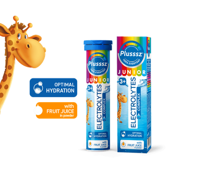 Plusssz Junior Electrolytes Complex contains 100% electro complex - a specially selected set for children and concentration of important electrolytes (sodium, potassium, magnesium), glucose and a complex of 5 vitamins in amounts providing 100% of daily Reference Intake Values. The components of the product contained in the effervescent tablet after preparation form a rehydration solution. Rehydration preparations are solutions that in their composition contain glucose, potassium and sodium in appropriate concentrations.